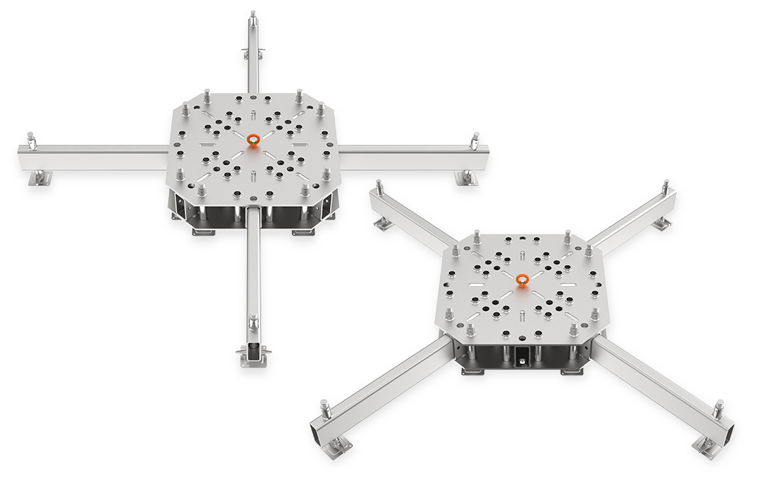Una versatilità estrema, predisposta per accettare torri da 40cm fino a 85cm. Un’unica base, pronta per ogni impiego. Un sandwich di due lastre di acciaio da 500kg di peso con 8 basette Layher regolabili per garantire la messa in bolla perfetta ed una adeguata distribuzione del carico.